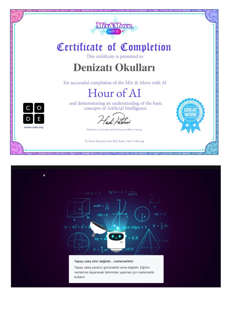 5.sınıf öğrencilerimizle Kodlama Saati etkinlikleri kapsamında, 1 ders saati boyunca code.org platformu üzerinden Mix & Move with AI etkinliğini gerçekleştirdik. Öğrencilerimiz bu keyifli etkinlik sayesinde hem temel kodlama becerilerini geliştirme fırsatı buldu hem de yapay zekâ destekli bir uygulama ile çalışma deneyimi kazandı.