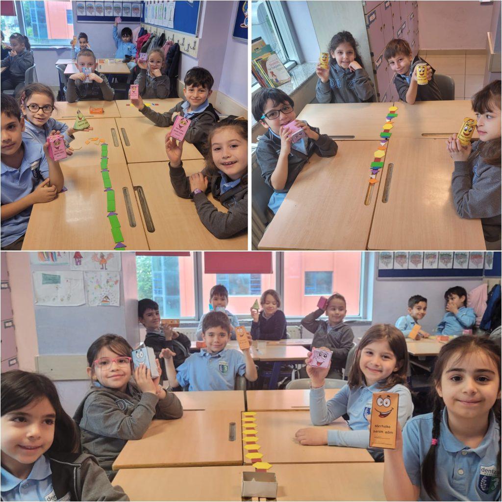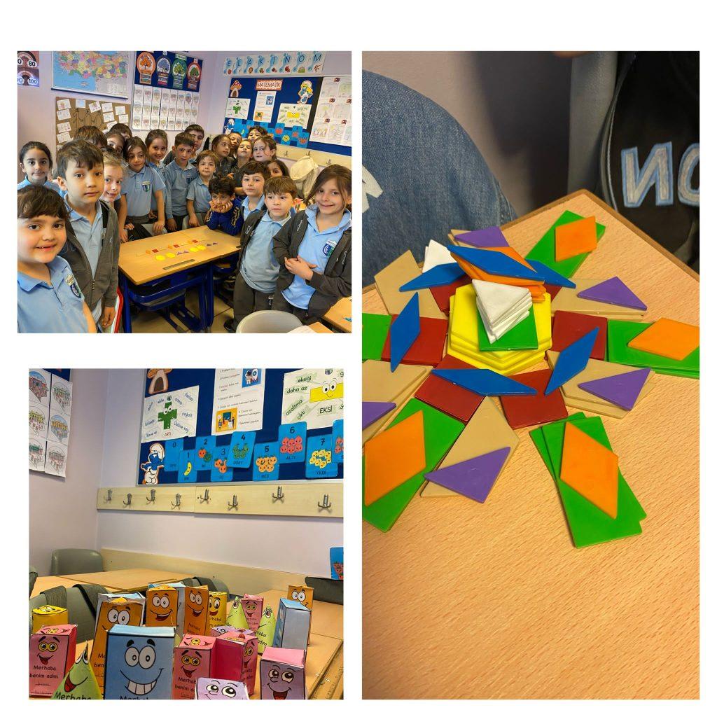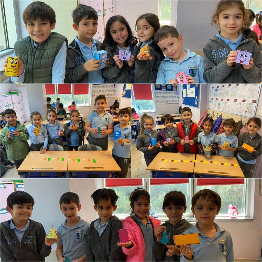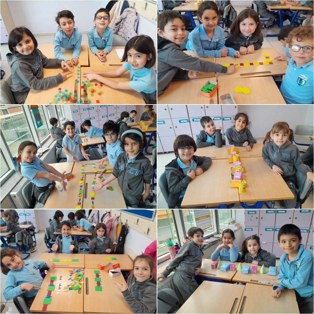 ŞEKİLDEN CİSME, CİSİMDEN ÖRÜNTÜYE… Sınıf öğrencilerimiz geometrik şekilleri inceleyerek kenar ve köşe sayılarına göre isimlendirdiler. Geometrik şekilleri bir araya getirerek geometrik cisimler oluşturdular. Bu cisimlerin özelliklerini tanıtarak geometrik örüntüler oluşturdular.