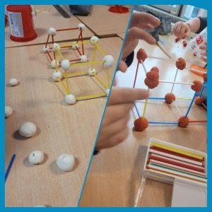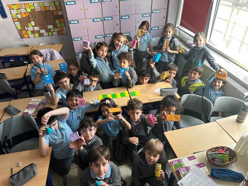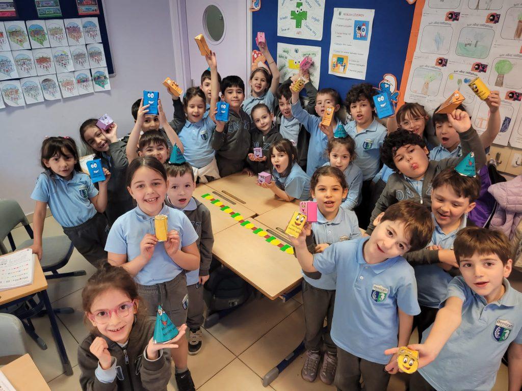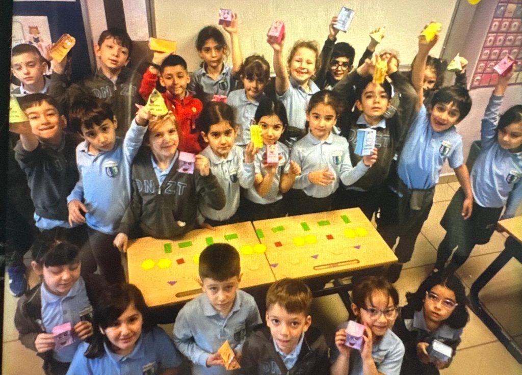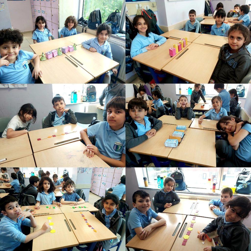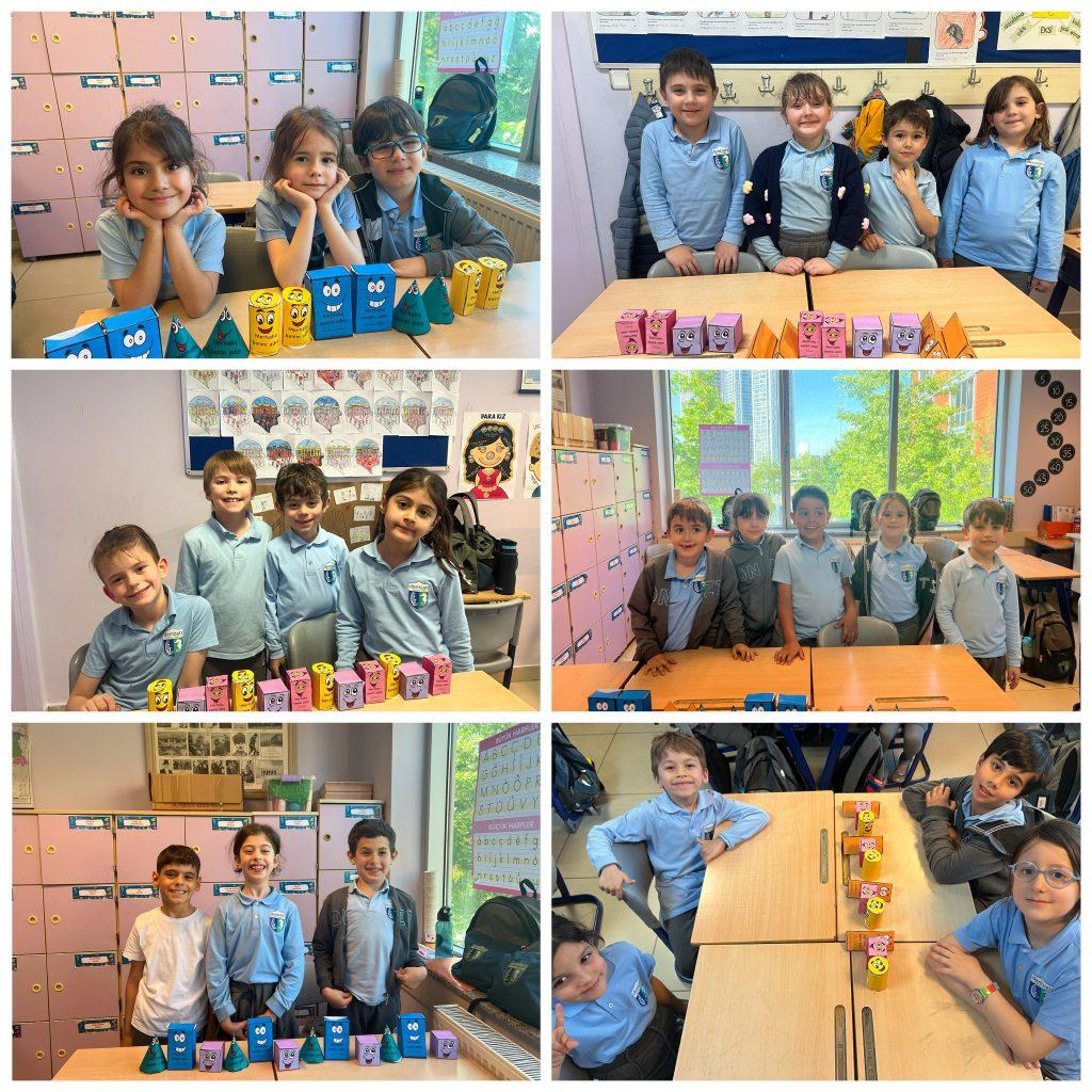 ŞEKİLDEN CİSME, CİSİMDEN ÖRÜNTÜYE… Sınıf öğrencilerimiz geometrik şekilleri inceleyerek kenar ve köşe sayılarına göre isimlendirdiler. Geometrik şekilleri bir araya getirerek geometrik cisimler oluşturdular. Bu cisimlerin özelliklerini tanıtarak geometrik örüntüler oluşturdular.