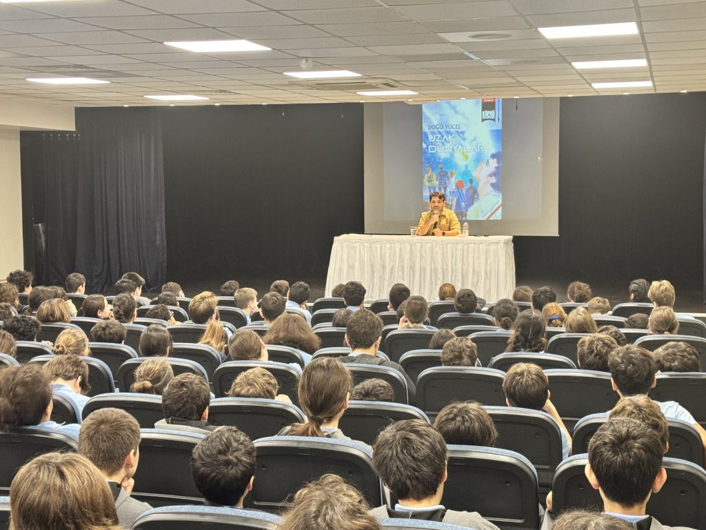 Okulumuzda bugün Uzak Dünyalar kitabının yazarı Doğu Yücel’i ağırladık. Konferans salonunda gerçekleştirilen söyleşide yazar, kitabını yazma sürecine dair samimi bilgiler paylaştı. Doğu Yücel, yazarlık serüvenini ve Uzak Dünyalar’ın ortaya çıkış hikâyesini anlatırken öğrenciler ilgiyle dinledi. Söyleşinin sonunda öğrenciler, yazarımıza merak ettikleri soruları yönelttiler.